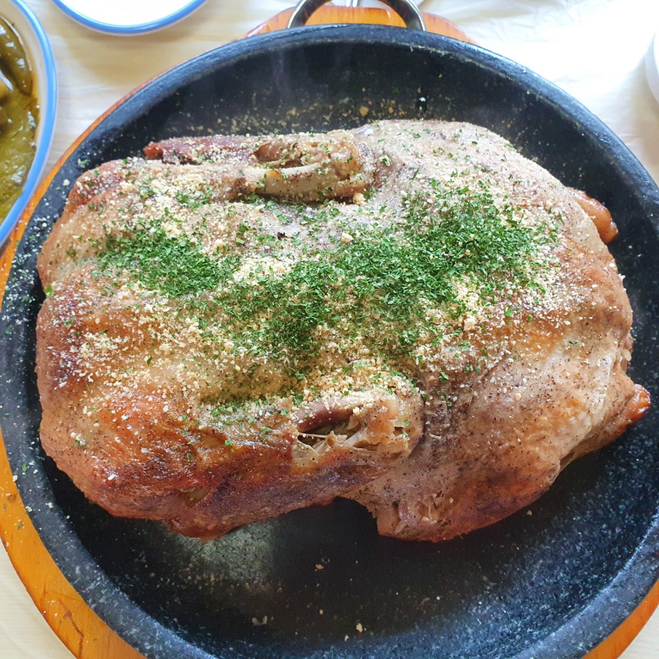 기다리던 찰흙구이가 돌판 위에 얹혀서 나왔습니다. 보기에도 기름기 쪽 빠진 모습이 맛있어 보입니다.